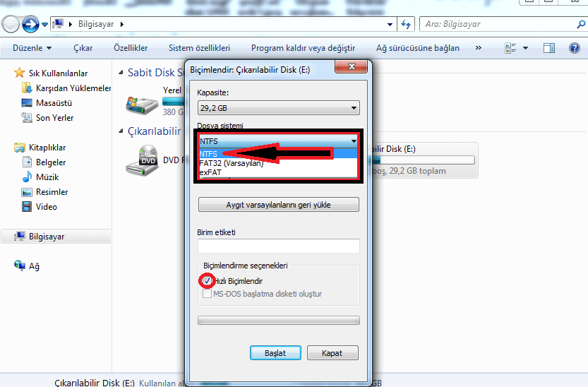 - Dosya sistemi bölümünde NTFS seçiniz ve hızlı biçimlendir bölümünü etkinleştiriniz.