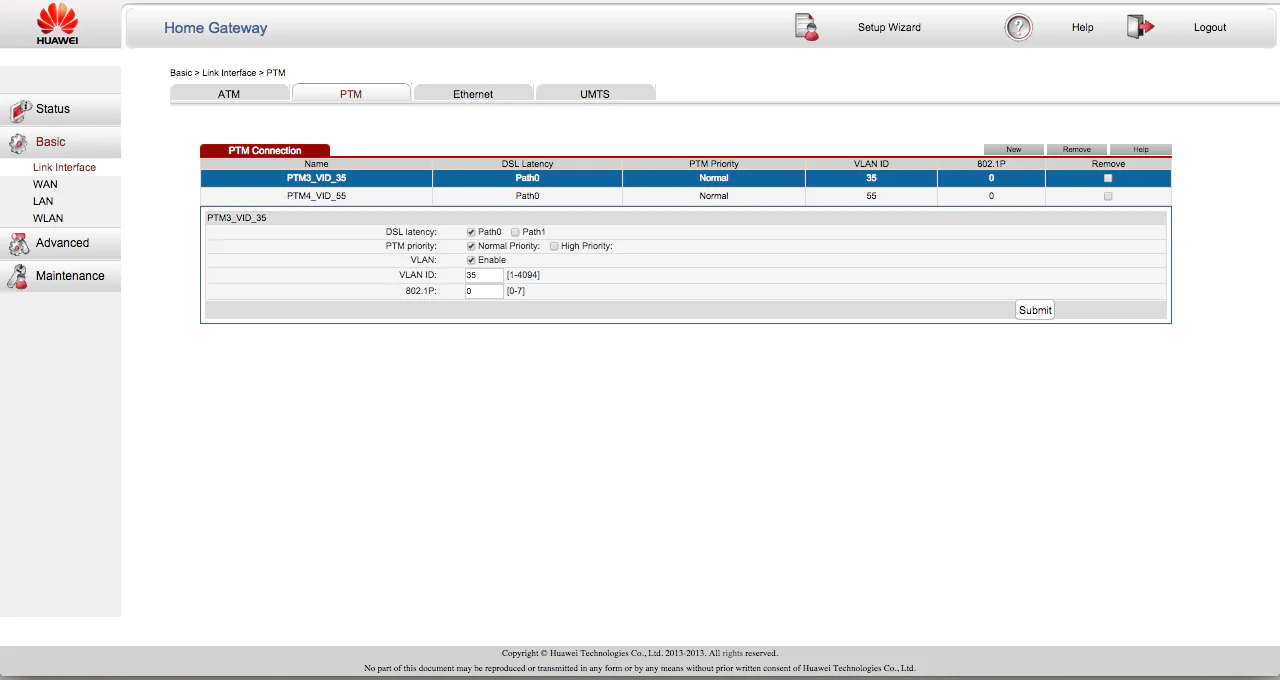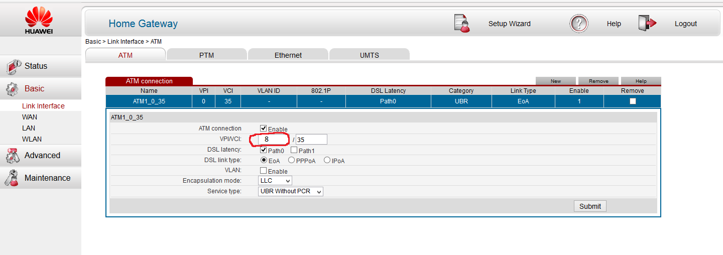 Link Interface bölümünden şimdi PTM ayarlarını düzenleyeceğiz.
