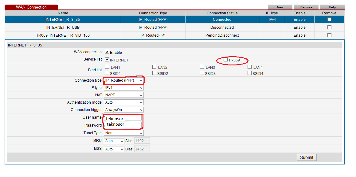 ‘’TR069’’ seçeneğinde tik işareti var ise kaldıralım ve Submit butonuna tıklayınız.