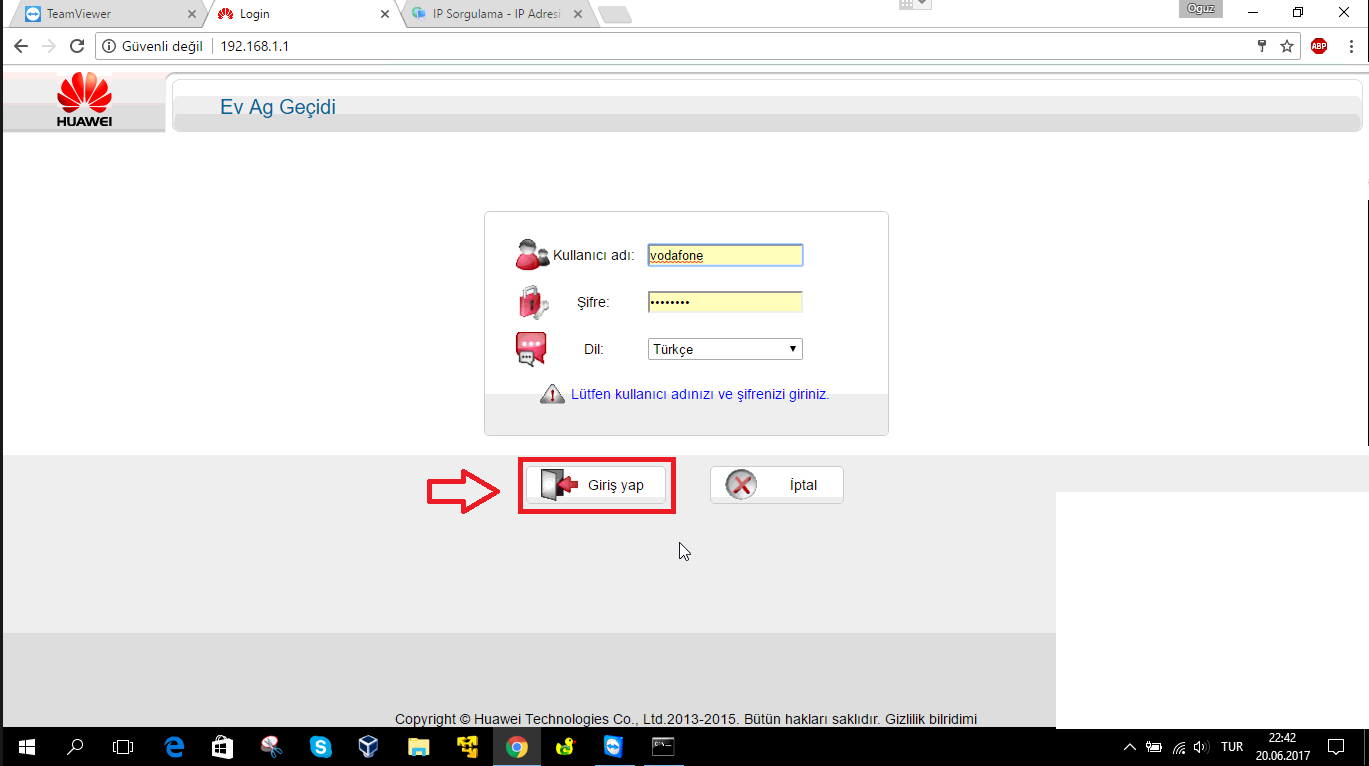 • ‘Kullanıcı adı’ ve ‘Şifre’ kutucuklarına küçük harflerle ‘vodafone’ yazdıktan sonra ‘Giriş yap’ butonuna tıklayalım.