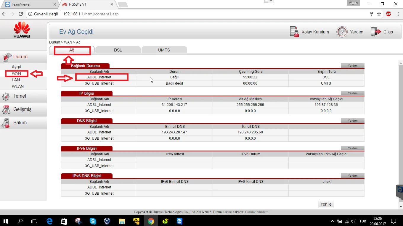 • Açılan modem arayüz sayfasında, sol taraftaki menü listesinden sırasıyla ‘Durum’ → ‘WAN’ menülerine tıklıyoruz. Açılan sayfada, üst kısımdaki sekmelerden ‘Ağ’ sekmesine tıklıyoruz ve açılan sayfada, port yönlendirme işlemi için kullanacağımız WAN Arabirimi adını öğreniyoruz.
