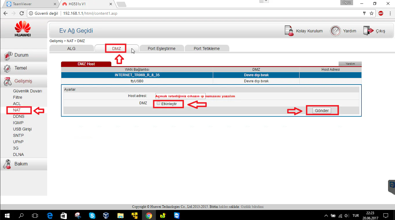 • Açılan sayfada ‘Host adresi’ bölümüne, port yönlendirme yapacağımız cihazın (DVR, sunucu vs.) yerel sabit IP adresini yazalım ve ‘DMZ’ yazısının karşısındaki ‘Etkinleştir’ kutucuğunu işaretledikten sonra ‘Gönder’ butonuna tıklayalıp, ‘DMZ’ yöntemi ile port yönlendirme işlemini tamamlıyoruz. Yalnız, genelde bu yöntem açılacak portların bilinmemesi durumunda kullanılır. Açılacak port numaralarını biliyorsanız, bu yöntemi kullanmamanızı tavsiye ederiz.