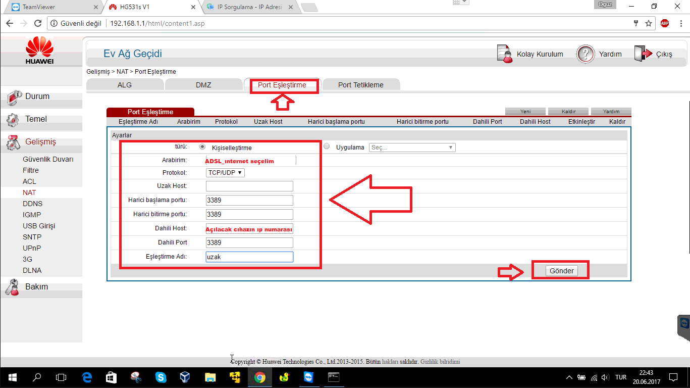 • 2. yöntemi anlatalım. Öncelikle bulunduğumuz sayfada üste kısımdaki sekmelerden ‘Port Eşleştirme’ sekmesine tıklayalım.