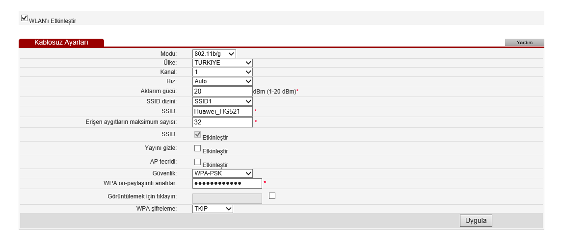 • ‘Güvenlik’ kısmında ise ‘WPA2-PSK’ seçeneğini seçtikten sonra sonra ‘Gönder’, ‘Uygula’ ya da ‘Kaydet’ butonuna tıklayıp ayarlarınızı kaydedebilirsiniz.
