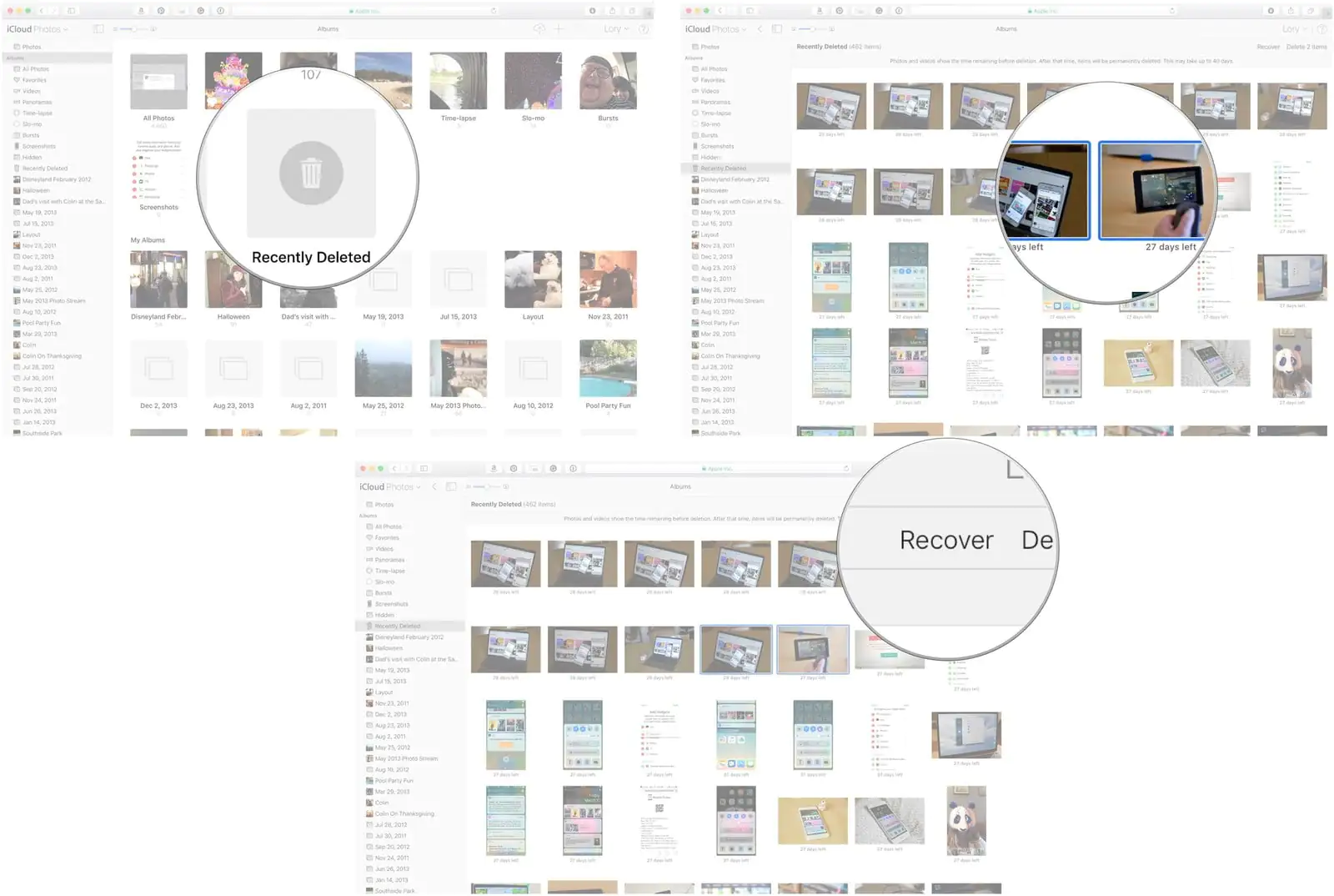 iCloud.com, tıpkı iPhone, iPad ve Mac‘teki ‘Fotoğraflar (Photos)’ uygulamasında olduğu gibi ‘Yakın Zamanda Silinenler (Recently Deleted)’ seçeneğine (menüsüne) sahiptir. Bu seçeneği (menüyü) kullanarak, son 40 gün içerisinde sildiğiniz fotoğrafları ‘iCloud Fotoğraf Kütüphanesi (iCloud Photo Library)’ne geri yükleyebilirsiniz.