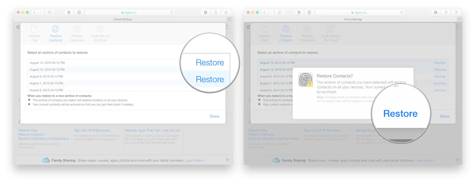iCloud‘da tek tek kişileri geri yükleyemezsiniz fakat iCloud‘un düzenli aralıklarla oluşturduğu yedekleme arşivlerinden birini geri yükleyebilirsiniz. Eski bir yedeklemeyi geri yükleme, eski yedeğin alındığı tarihten itibaren eklenen kişileri kaldıracak (eklemeyecek) (Ancak iCloud, eski yedeği geri yüklemeden önce o anki veritabanının (kişilerin, rehberin) yedeğini alacak). Rehberinizdeki veriler (kontak (kişi) bilgileri) bozulduysa ve rehberinizdeki birçok kişi (yanlışlıkla) silindiyse, yedekleme arşivini geri yükleyerek rehberi kurtarmak en iyi yöntemlerden biridir.