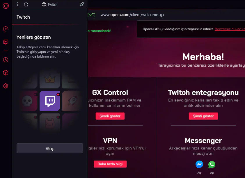 Kenar çubuğu aracılığıyla hizmetlere giriş yapmak uzun süredir devam eden bir Opera özelliği oldu, ancak şu ana kadar yalnızca WhatsApp, Facebook Messenger, VK ve Telegram gibi hizmetleri destekledi. Şimdi Twich i de bünyesinde barındırmaktadır.