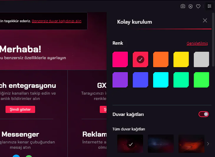 Kolay Kurulum menüsünü açın (Opera‘da olduğu gibi) ve hemen varsayılan rengi RGB spektrumundaki başka bir renkle değiştirmeye devam edebilirsiniz. Ayrıca Opera GX‘e özgü birkaç ek duvar kâğıdı da vardır ve kendi görüntülerinizi içe aktarmayı da seçebilirsiniz.