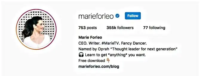 Örneğin, Marie Forleo’yu ele alalım. Biyografisi ne yaptığını anlatıyor ve hatta bazı sosyal kanıtlar için Oprah’dan yararlanıyor.