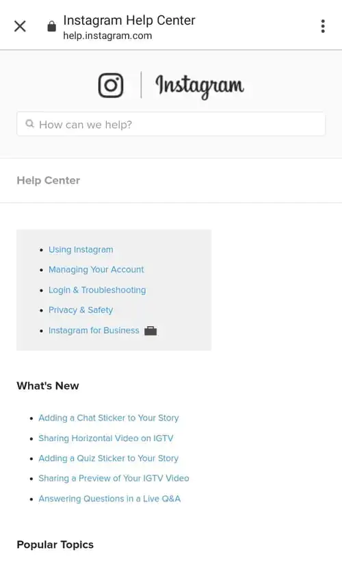 - Instagram Yardım Merkezi (Instagram Help Center) sayfasında, sorununuza çözüm aramaya başlamak için bir sorun veya konu seçin.