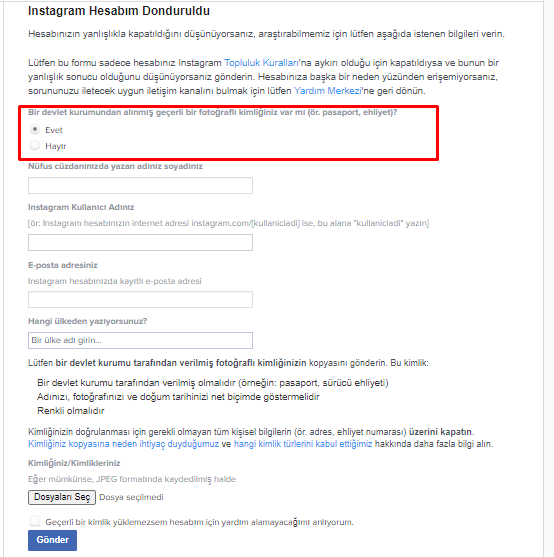 İnstagram hesabım donduruldu veya geçici süreliğine dondurdunuz ve tekrar giriş yapamıyor iseniz, şifrenizi unuttuğunuz için yada giriş yaptığınızda hesabınızın askıda olduğunu bildiren bir uyarı metni görüyorsanız aşağıdaki işlemleri yapabilirsiniz.