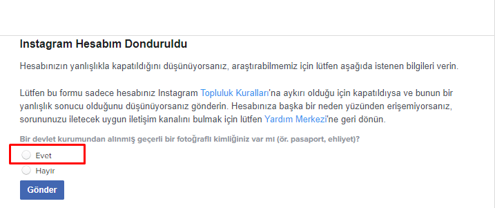 Açılan İnstagram yardım sayfasından gösterildiği üzere Evet bölümünü işaretleyelim.