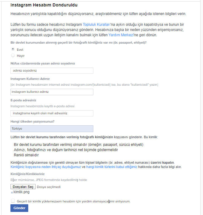 Nüfus cüzdanınızda yazan adınız soyadınızInstagram Kullanıcı Adınız[ör: Instagram hesabınızın internet adresi instagram.com/[kullaniciadi] ise, bu alana “kullaniciadi” yazın]E-posta adresinizInstagram hesabınızda kayıtlı e-posta adresiHangi ülkeden yazıyorsunuz?Lütfen bir devlet kurumu tarafından verilmiş fotoğraflı kimliğinizin kopyasını gönderin. Bu kimlik: