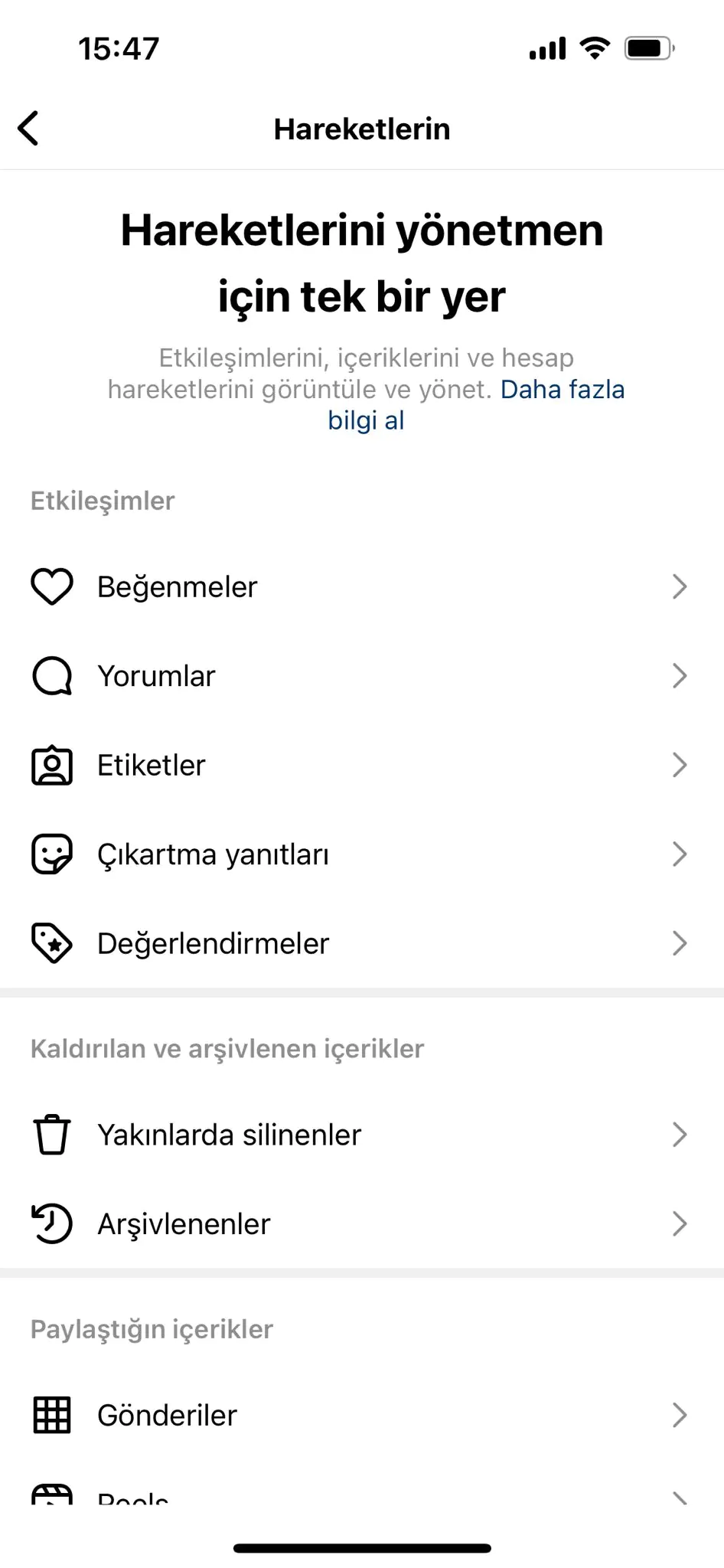 Öncelikle hesap profilinizi açın ve sağ üst köşedeki üç çizgi simgesinden ‘ hareketlerin ‘sayfasını açalım. Burada bizi tam 6 kategori karşılıyor.