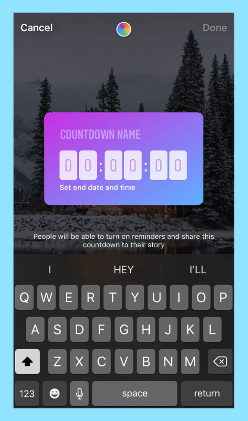 • Geri sayım etiketinizin görünümünden memnun kaldığınızda ve ekranın sağ üst kısmındaki ‘Bitti (Done)’ seçeneğine dokunduğunuzda, geri sayım etiketi eklediğiniz gönderinizi (hikayenizi) paylaşmaya hazırsınız.