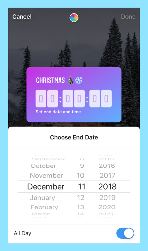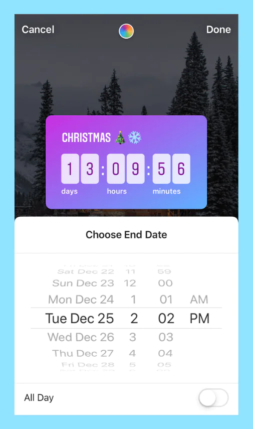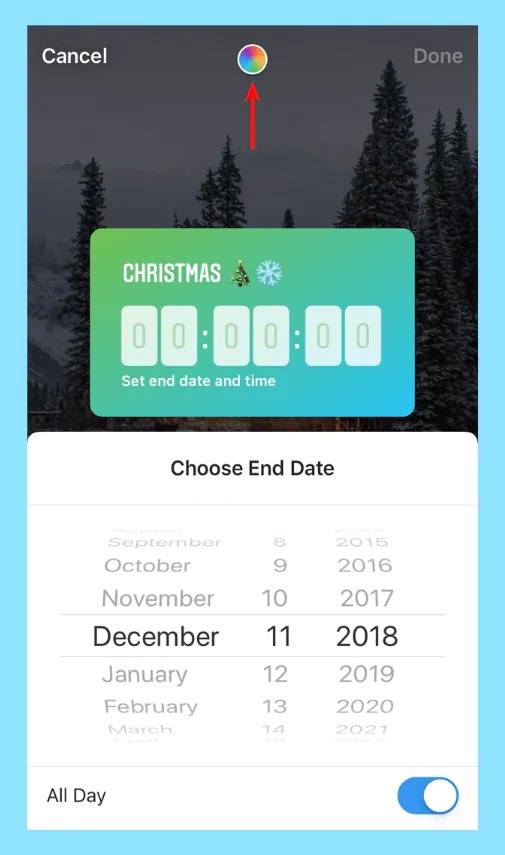 • Şimdi geri sayımın zamanını ayarlama aşamasındayız! ‘Tüm Gün (All Day)’ seçeneğini aktif ederek, geri sayım sürenizi 1 güne kadar uzatabilirsiniz (sayaç, seçtiğiniz günün gece yarısında -00:00:00’da- duracak).