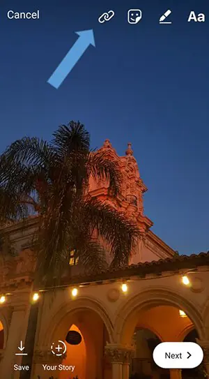 - Hikâye (Story) düzenleyicide, ekranın üst kısmındaki (zincir gibi görünen) bağlantı simgesine dokunun.