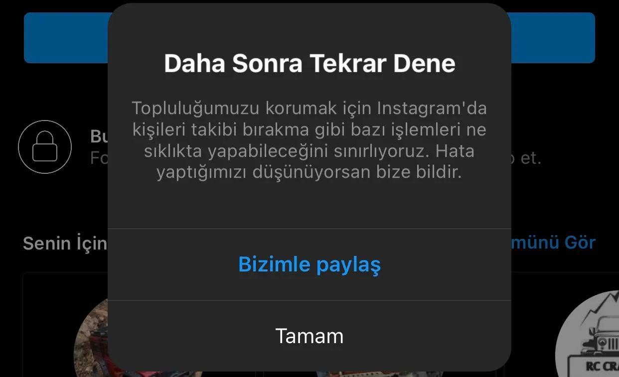 • Aynı anda çok fazla kullanıcıyı takip etme/takipten çıkarma