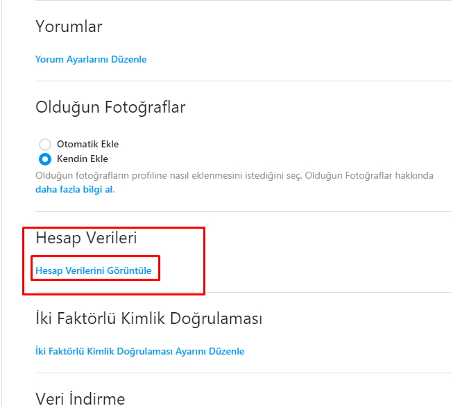 Web tarayıcısından giriş yaptıysanız ayarlardan sonra Gizlilik ve Güvenlikten sonra hesap verilerini görüntüle seçneğine tıklayalım.