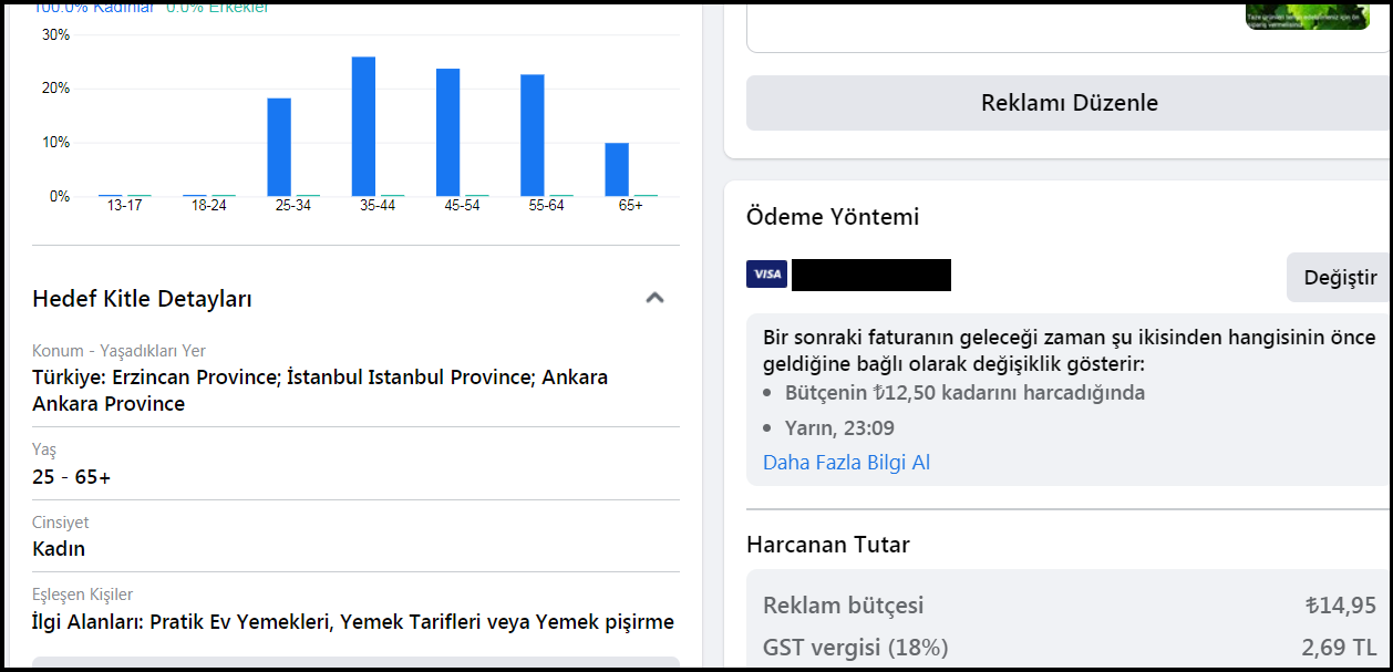 Sizlere yukarıdaki metinde ilk aşamada düşük bütçe ve kısa süreli reklam vermenizi tavsiye etmiştik. Bunun sebebi ilk reklamınızdan elde ettiğiniz analiz bilgilerini değerlendirerek yenisini geliştirmek. Etkileşim almadığınız yaş gurubunu hedefinizden çıkarmalısınız. İlgi alanlarını değiştirerek tanıtım yaptığınız bölgeye hariç tutulan bölgeler ekleyebilirsiniz. Ayrıca yeni bölgeler ekleyerek yeni keşifler elde edebilirsiniz.