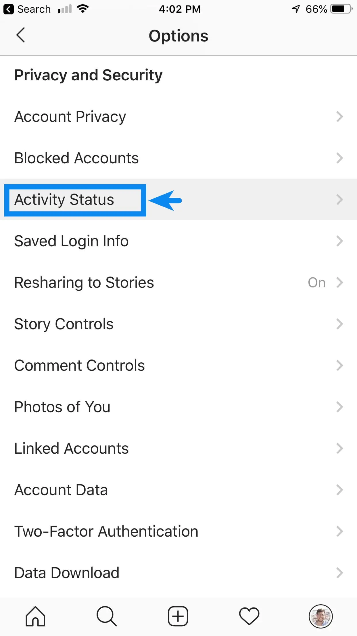 • Açılan menü listesinde ‘Gizlilik ve Güvenlik (Privacy and Security)’ başlığı altında bulunan menülerden ‘Etkinlik Durumu (Activity Status)’ menüsüne dokunun.