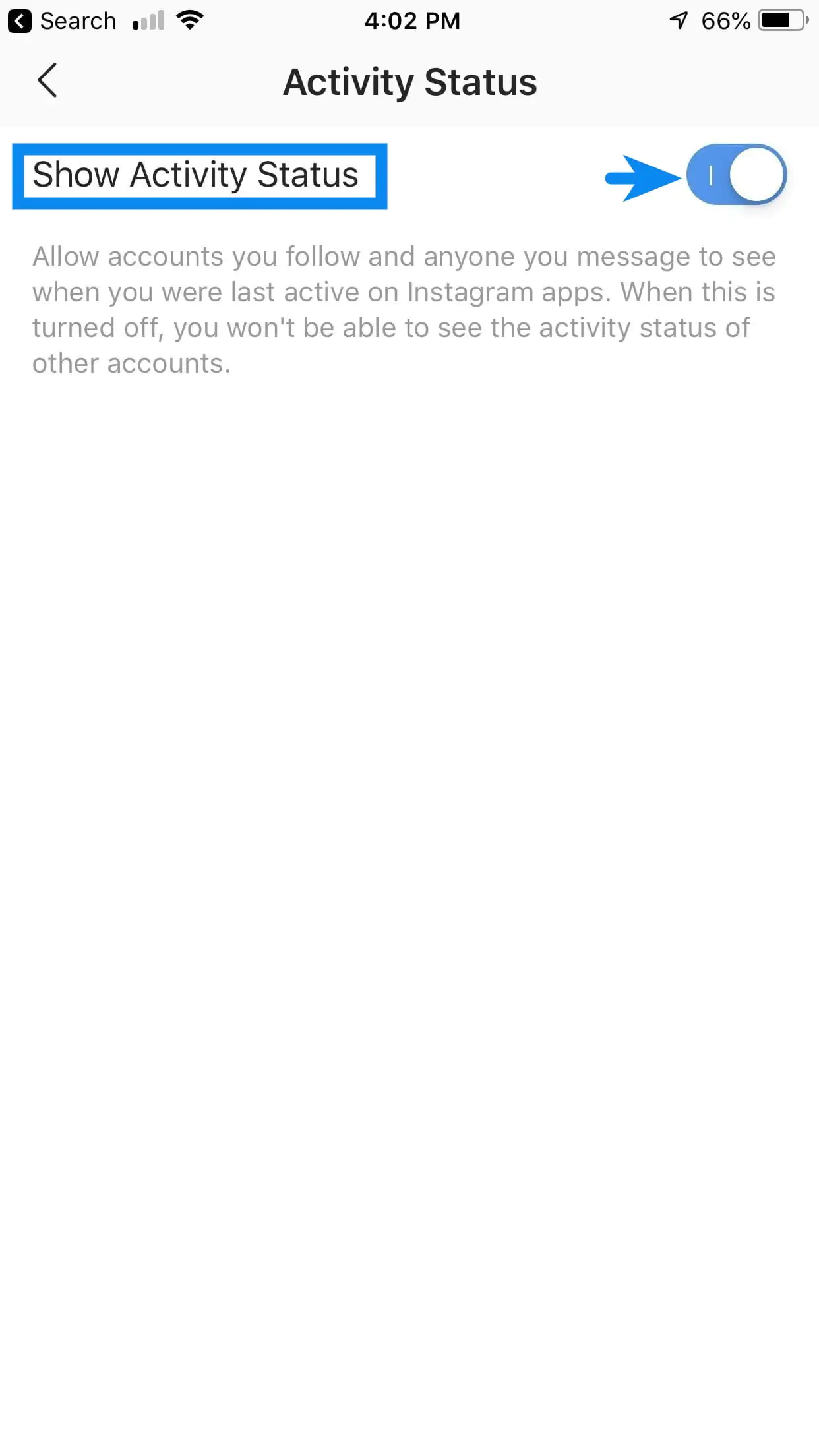 • Gelen sayfada ‘Etkinlik Durumunu Göster (Show Activity Status)’ seçeneğinin yanındaki kaydırma (switch) butonunu pasif (devre dışı) konuma getirin.