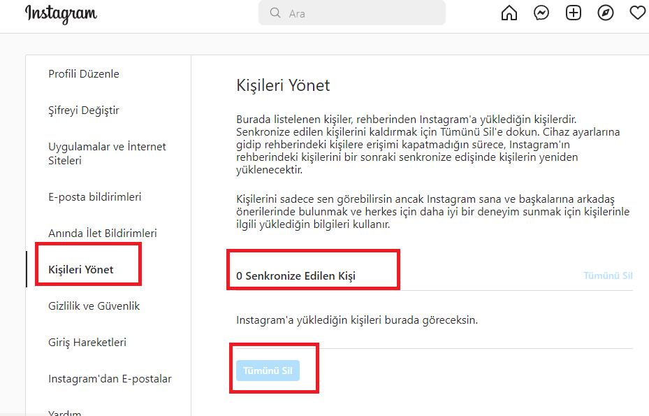 Yukarıdaki adımların sonrasında telefon rehberinizdeki kişilerin sunucuya kaydedilmesi engellenecektir. Daha öncesinde kaydedilen numaralar sunucu üzerinden temizlenmiş olacaktır. Bu işlemleri başlatmadan önce mobil cihazınızdan instagram uygulamasına giriş yaparak Rehber senkronizasyonu özelliğini devre dışı bırakmanız gerekecektir.