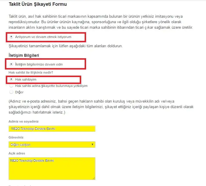 - “Taklit Ürün, asıl hak sahibinin ticari markasının kapsamında bulunan bir ürünün yetkisiz imitasyonu veya reprodüksiyonudur. Bu ürünler ürünün kaynağına, sponsorluğuna ve ilgili olduğu şirketlere yönelik olarak insanların aklını karıştırmak ve bu sayede ticari marka sahibinin itibarından ticari çıkar sağlamak üzere üretilir.” açıklamasının devamındaki “Anlıyorum ve devam etmek istiyorum” seçeneğini seçip işlemlerimize devam ediyoruz.