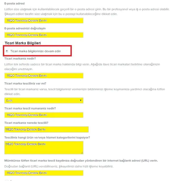 - “Ticari Marka Bilgileri” başlığı altındaki
