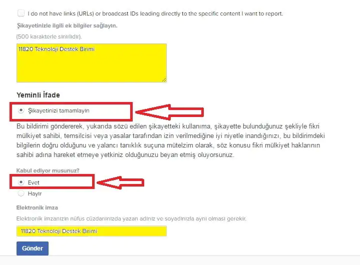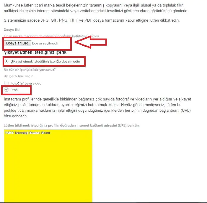 - “Lütfen bildirmek istediğiniz Profilin doğrudan İnternet bağlantı adresini (URL) belirtin.” kısmına ise ilgili profilin URL bilgisini kopyalayıp bu alana ekliyoruz.