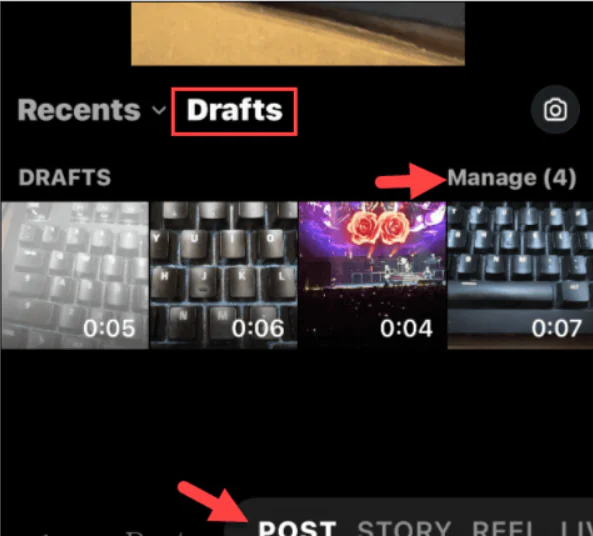 - Ekranın altındaki menüden Gönder’i seçin, Taslaklar seçeneğini seçin ve taslak seçiminizin üzerindeki Yönet’e dokunun. Tüm yayınlarınızın ve videolarınızın aynı bölümde listeleneceğini unutmayın.