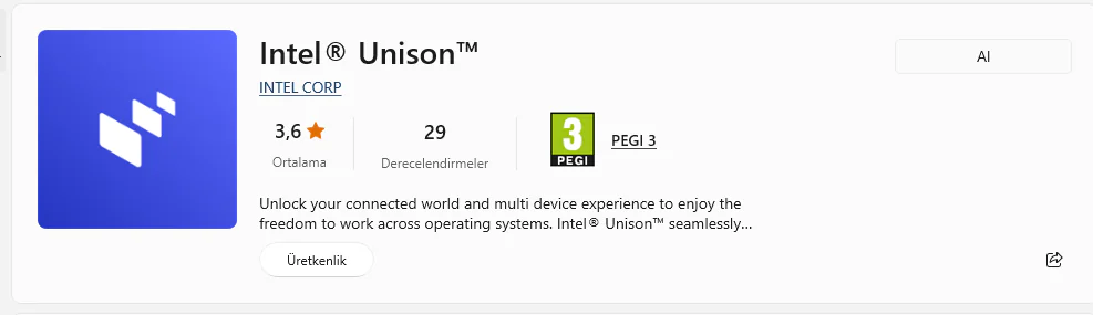 Daha sonra Windows bilgisayarınızda ise Microsoft Store üzerinden İntel Unison uygulamasını indiriniz. Ancak Windows bilgisayarda işletim sistem en az Windows 11 gereklidir. Aksi halde Microsoft Store üzerinden indirme yapamazsınız.