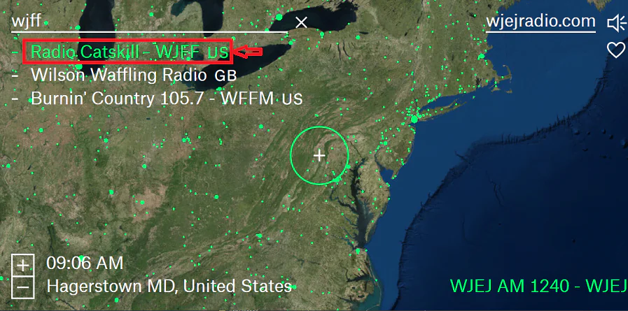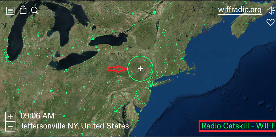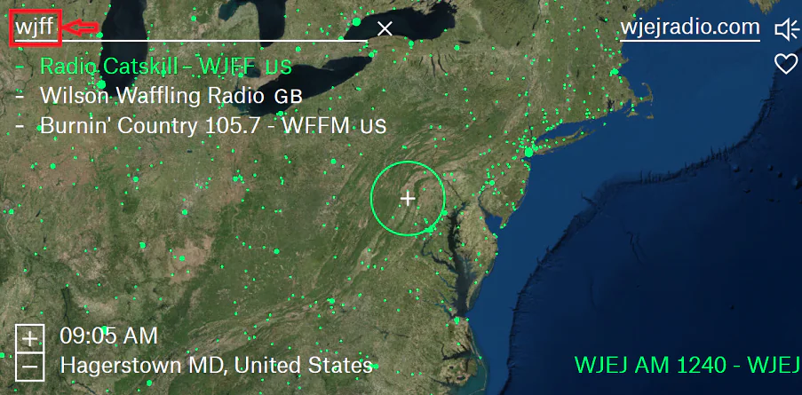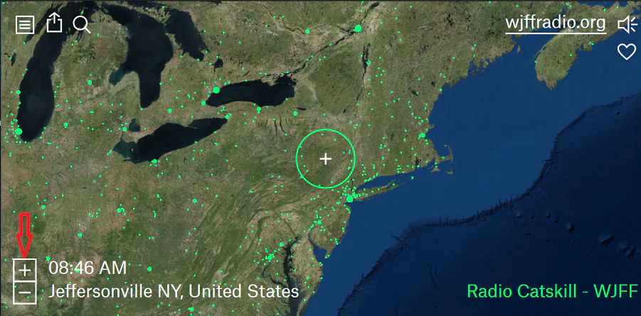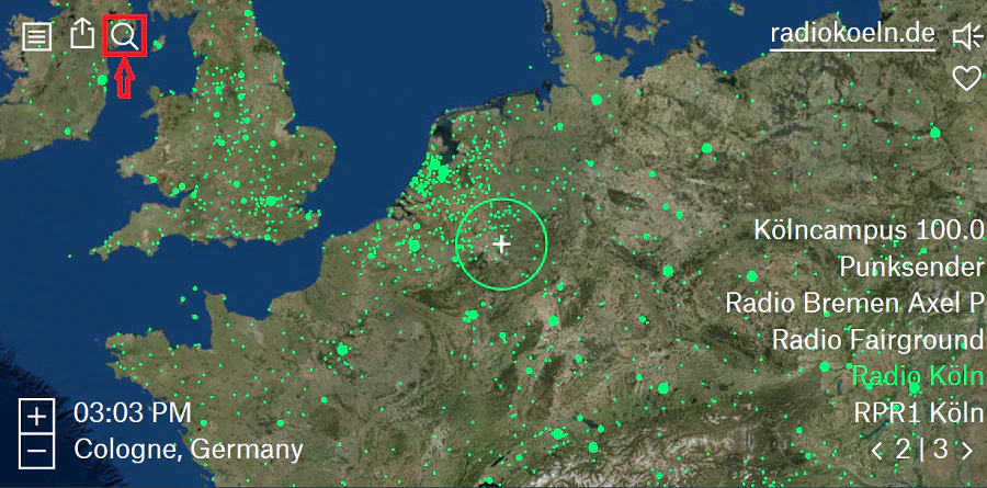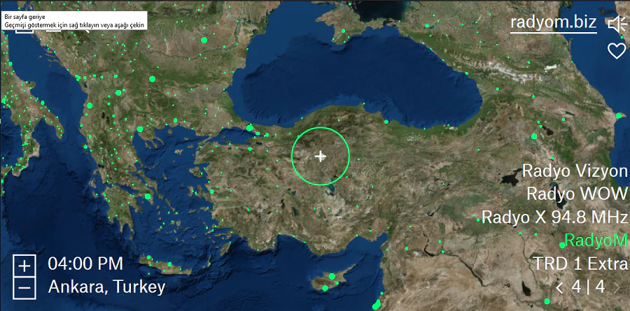 - Zoom yaptığınız (haritayı yaklaştırdığınız) ülke veya bölgede bulunan herhangi bir radyoyu dinlemek için küçük yeşil noktalara tıklamanız yeterli.