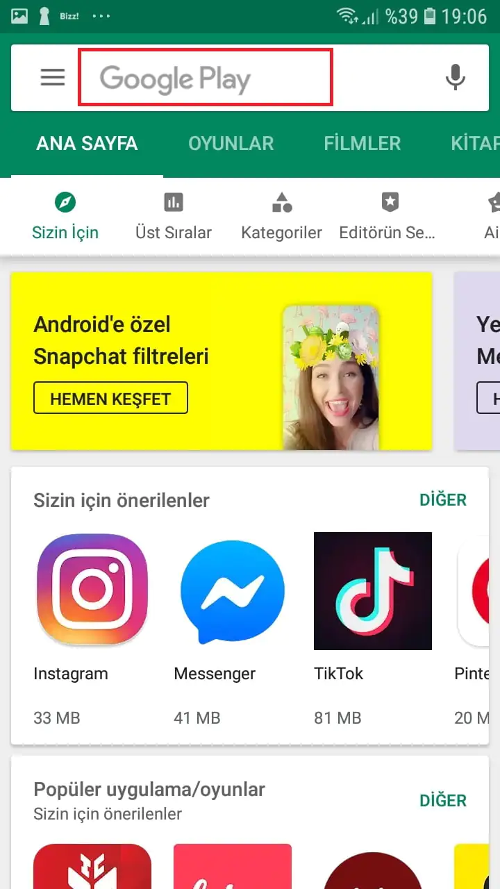 - Uygulama marketi uygulamasının arama kutucuğuna dokunuyoruz.