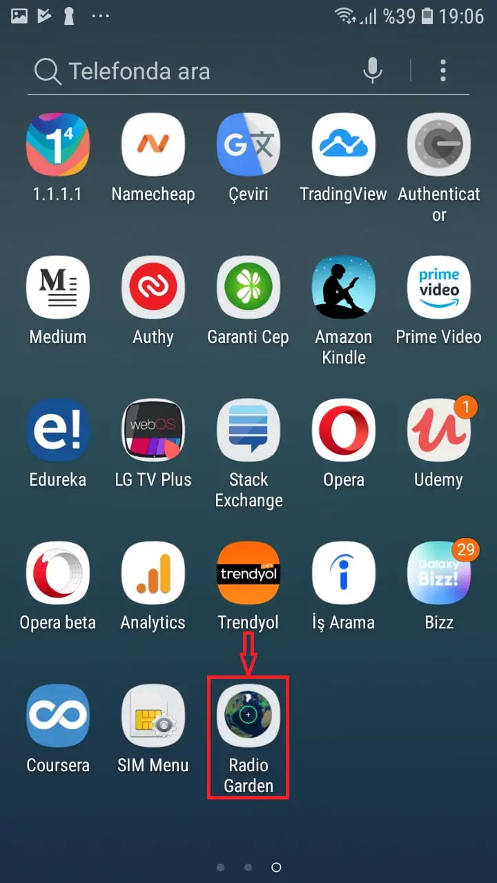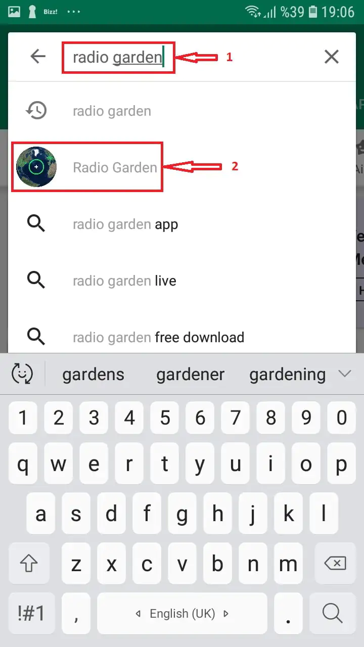 - Arama kutucuğuna ‘radio garden’ yazıyoruz ve çıkan arama seçeneklerinden ‘Radio Garden’ seçeneğine dokunuyoruz.