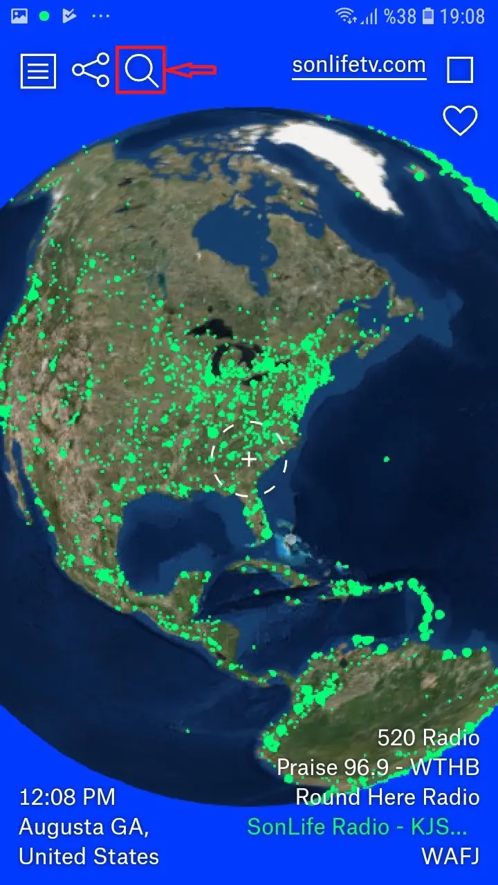 - Herhangi bir radyo istasyonunu aramak veya herhangi bir konumu aratarak, o komum radyo istasyonlarını görüntülemek için, uygulama penceresinde sol-üst kısımda bulunan mercek şeklindeki simgeye (butona) dokunuyoruz.