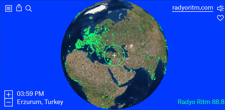 - Radyo istasyonları, küre şeklindeki dünya haritası simülasyonuna yüklendikten sonra rastgele bir konumdaki (lokasyondaki) radyo istasyonu yayını çalmaya başlayacak.