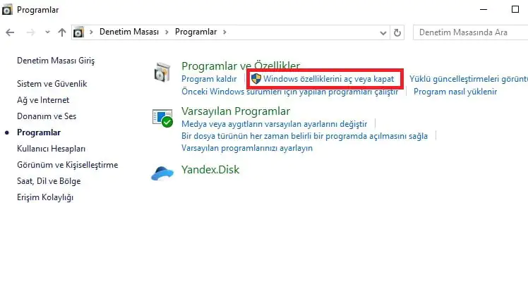 - Denetim Masası → Programlar → Windows özelliklerini aç ve kapat adımlarına tıklayalım.
