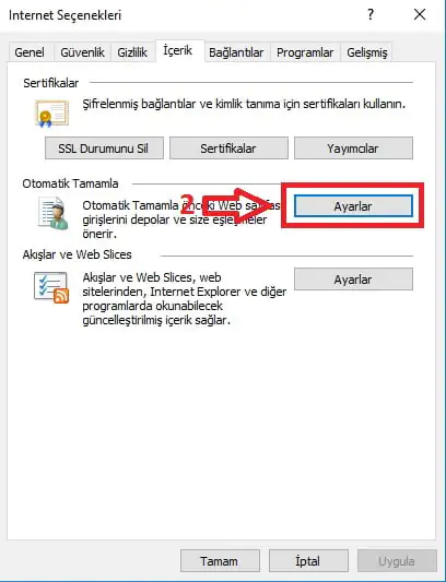 1. Daha sonra açılan İnternet Seçenekleri penceresinde bulunan İçerik sekmesine tıklıyoruz ve bu sekmenin alt menülerinde bulunan Otomatik Tamamla bölümündeki Ayarlar butonuna tıklıyoruz.