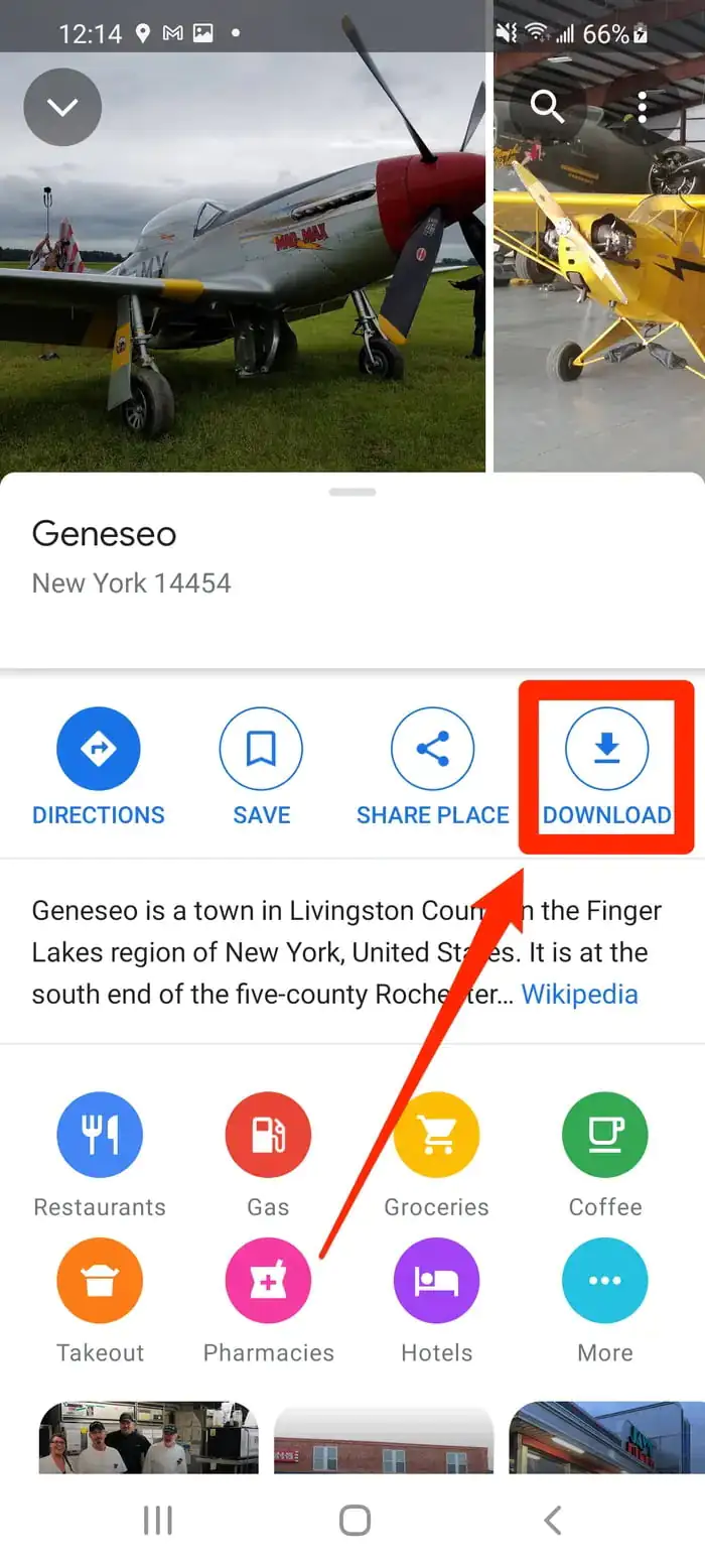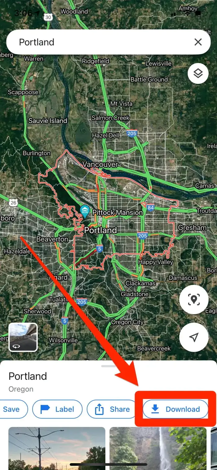 - Harita, aradığınız konumu gösterecek şekilde konumlanacak; ve ekranın alt kısmında birkaç seçenek sunan bir sekme belirecektir. Haritanın alt kısmında adresin altında yer alan menüleri sağa kaydırın İndir (Download) menüsüne dokunun.