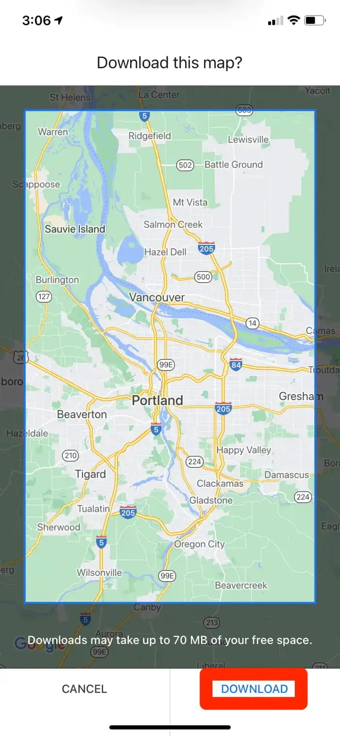 - Google Haritalar uygulaması, indirme işlemini onaylamanızı isteyecek; ve indireceğiniz haritanın telefonunuzda ne kadar yer kaplayacağını söyleyecek. İndirmeyi başlatmak için İNDİR (DOWNLOAD) seçeneğine dokunun.
