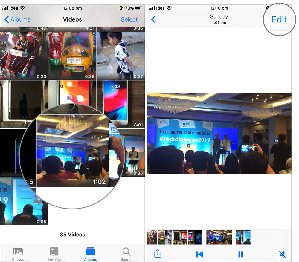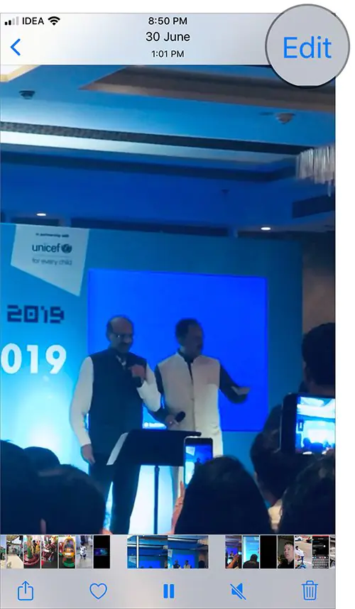 - Kırpmak istediğiniz bir video seçin ve ekranın sağ-üst köşesindeki Düzenle (Edit) seçeneğine (linkine) dokunun.
