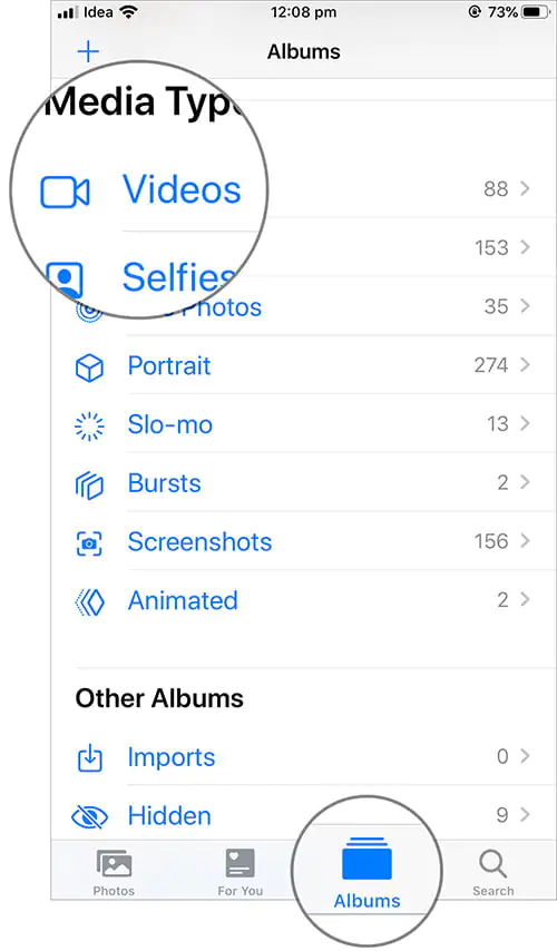 - Videolar (Videos) bölümüne gidin veya Albümler (Albums) seçeneğini seçin.