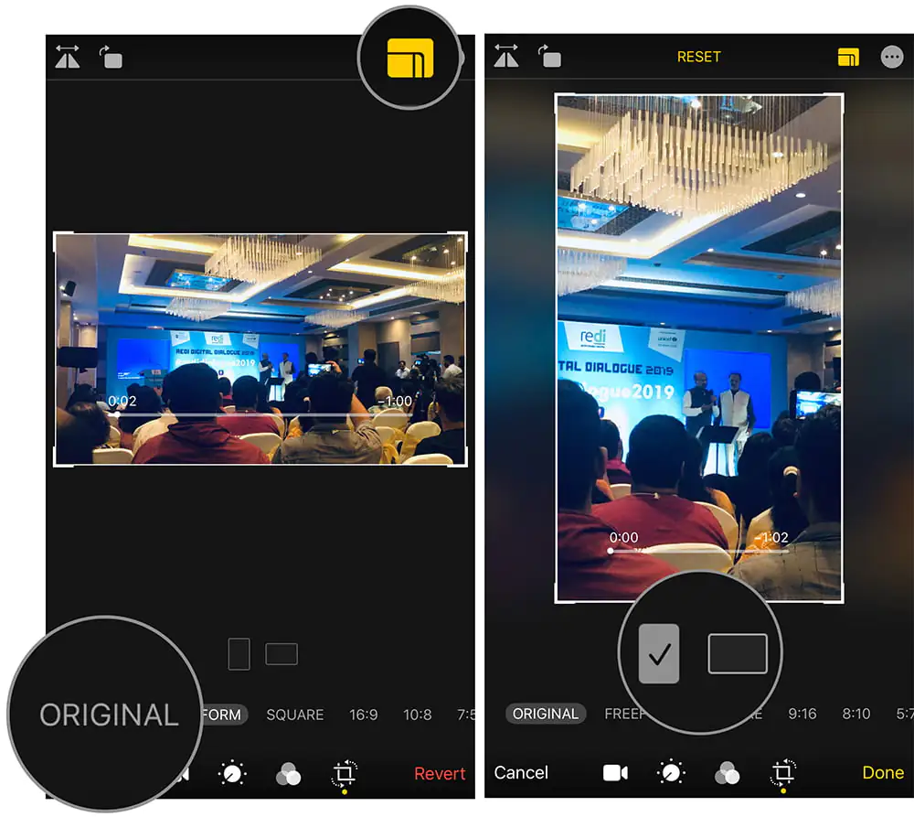 - Daha kusursuz bir kırpma için, ekranın sağ üst köşesindeki En Boy Oranı (Aspect Ratio) butonuna ve ardından videonun yönünü yataydan dikeye veya tam tersine değiştirmek için ORJİNAL (ORIGINAL) sekmesine dokunun.