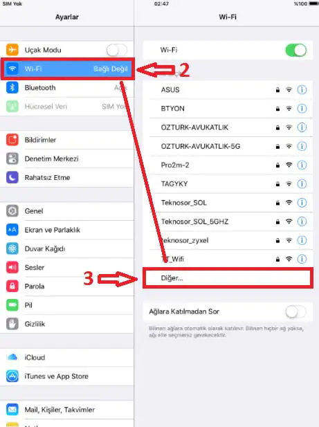 “Ayarlar” menüsünden ise “Wi-Fi” bölümüne giriyoruz. Daha sonra ise, bu bölümde bulunan “Diğer…” menüsüne giriyoruz.