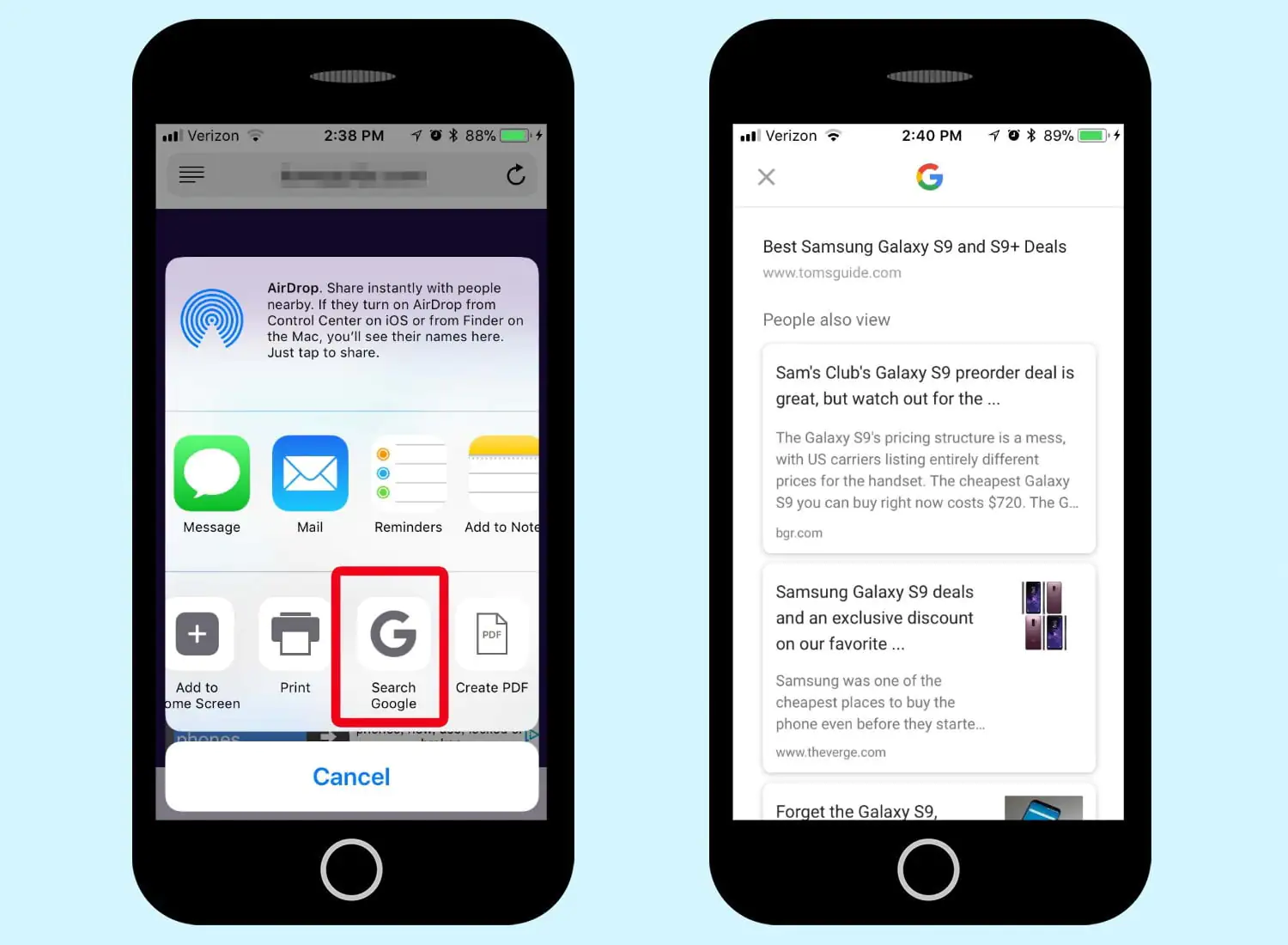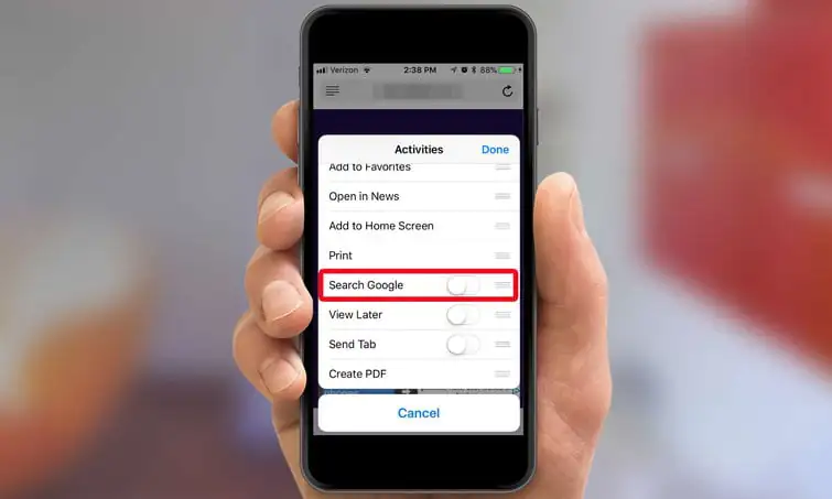 - ‘Search Google’ şimde ek aktiviteler menüsünde (ekli olarak) görünecek. Daha sonra bu ‘Search Google’ simgesine dokunduğunuzda Google uygulaması, Safari’de görüntülediğiniz web sayfası içeriği ile alakalı tüm sayfaları liste halinde gösterecek.