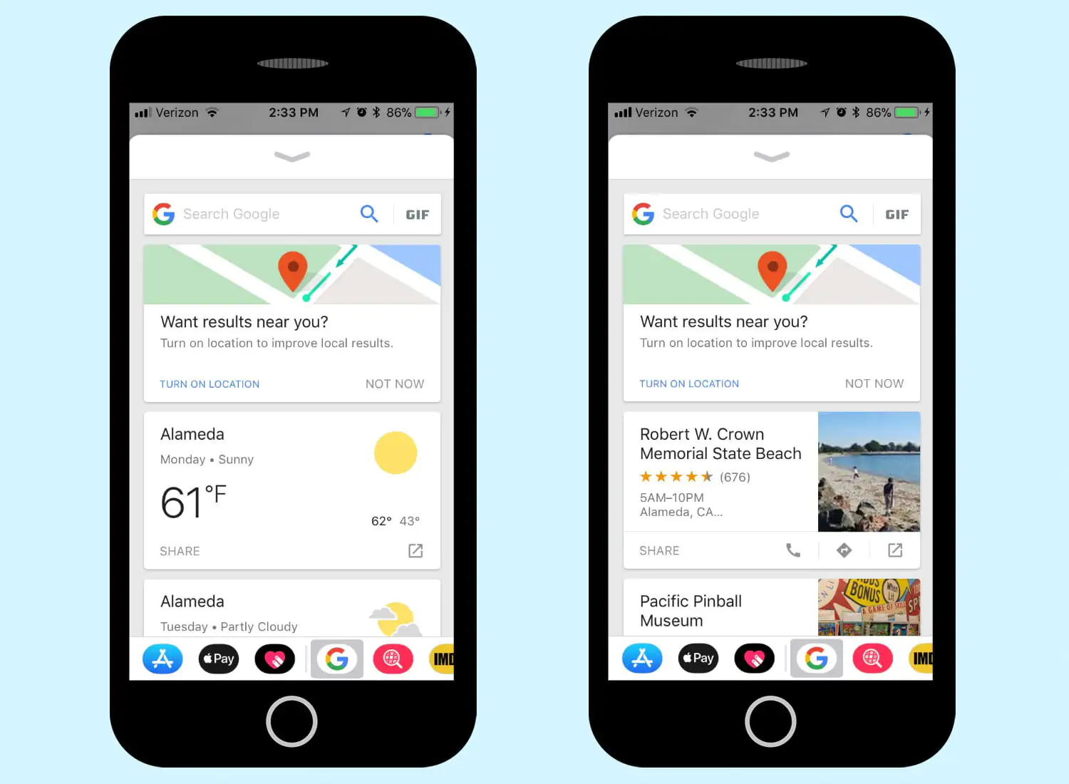 Google Arama Çubuğu’nu arama motoru (aracı) olarak kullanmanın yanı sıra GIF animasyonları arayabilirsiniz ve ayrıca ‘Hava Durumu (Weather)’, ‘Yiyecek (Food)’, ‘Yakın Yerler (Nearby)’, ‘Trendler (Trending)’ ve ‘Videolar (Videos)’ gibi Google servislerini kullanarak arama yapabilirsiniz. İlk iki seçenek (‘Hava Durumu (Weather)’, ‘Yiyecek (Food)’), isimlerinden de anlaşılacağı gibi, bulduğunuza konuma ait birkaç günlük hava tahmin raporunu ve bulunduğunuz konum itibari ile yakınınızdaki restauranların bilgisini verecek. ‘Yakın Yerler (Nearby)’ seçeneği ise, bulunduğunuz konuma yakın ve öne çıkan (önemli) 411 (adet) yerel konumu gösterecek.