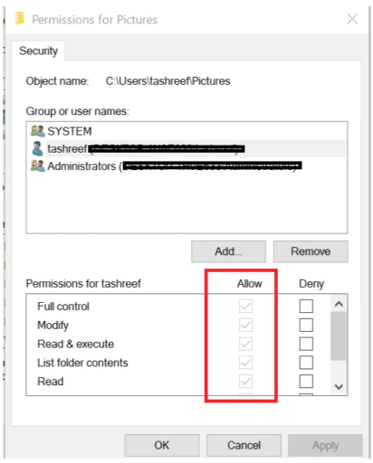 (Kullanıcı adınız) için İzin altında, İzin Ver bölümünde tüm kutuların işaretli olduğundan emin olun.