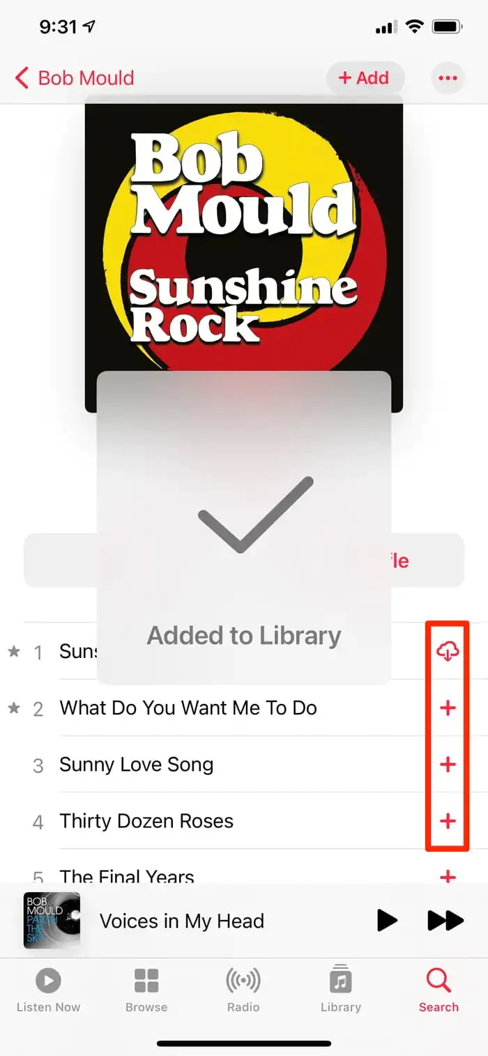 - + (artı) işaretine dokunarak seçtiğiniz müzikleri otomatik olarak indirilmeye başlayacak. Ancak, + (artı) işareti kaybolmadan bir ☁ (bulut) simgesi ile değişirse, ☁ (bulut) simgesine dokunun. Bu, indirme işlemini başlatacaktır.