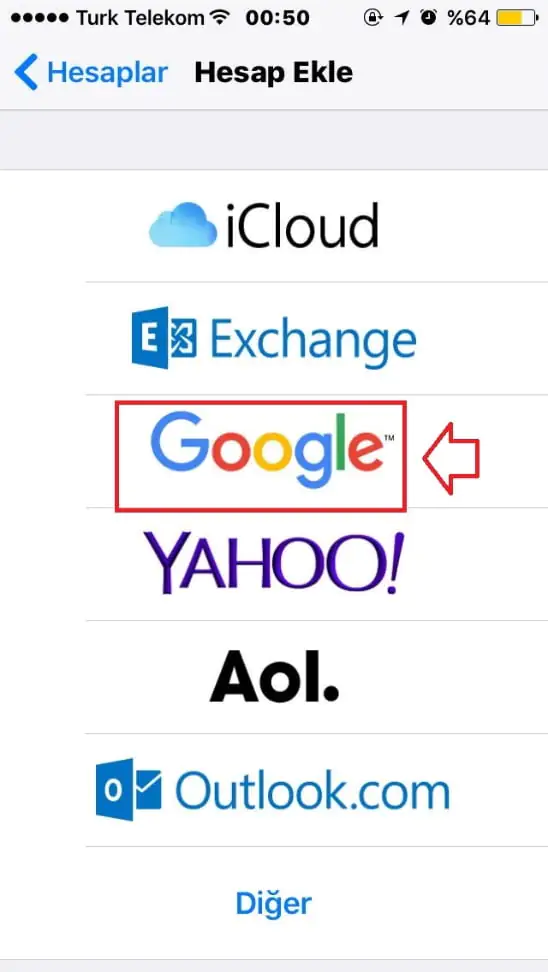 “Hesap Ekle” menüsüne tıkladıktan sonra açılan sayfadaki hesaplardan Google‘ı seçelim.